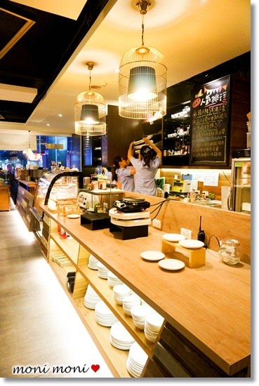 一進門口的結帳櫃檯,旁邊是甜點櫃和長長的吧檯,上面的燈飾還是鳥籠的造型,蠻具有奢華的感覺,跟外頭的復古感落差懸殊。