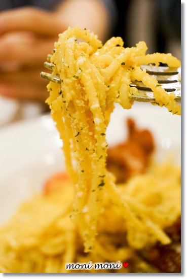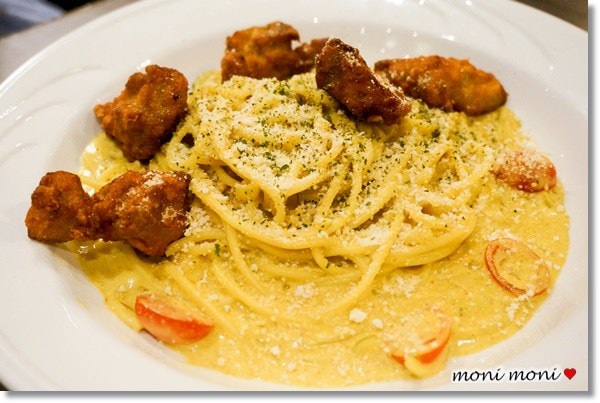 這道義大利麵實在太特別了,居然是咖哩口味的,上面還是日式唐揚雞呢~
