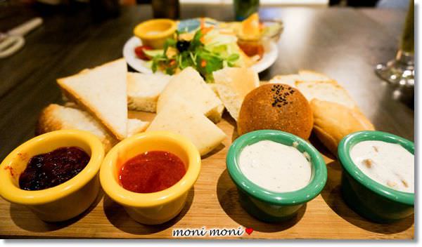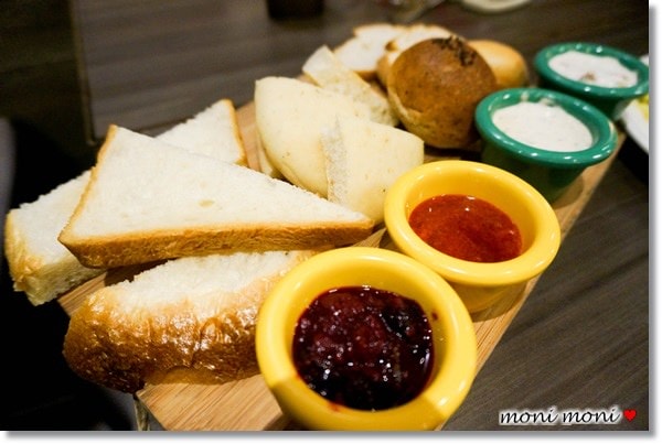 沾醬則是有四款,第一次有這麼澎湃的組合,讓我看得好興奮,有義式鮪魚核桃、莓果醬、草莓醬、蘑菇醬