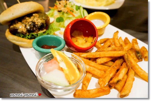 他的分量也大的十足,除了佛卡夏的香料麵包堡之外,還搭配著薯條、水果、百香果青木瓜、以及沙拉等等,一份真的會很飽。
