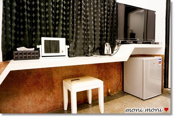 旁邊的桌子採用階梯式的高起,不占空間,卻又讓我們有把放行李的地方及化妝的化妝台。