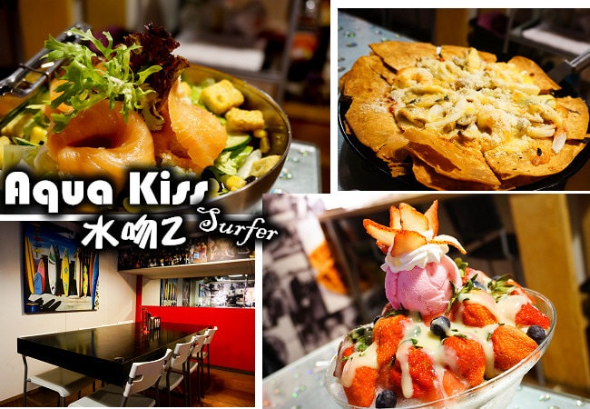 在內湖科學園區悄悄的發展出一系列的異國料理, 就連南台灣墾丁的餐廳都到這裡開店,將南台灣的熱情陽光四散在台北。 最近在師大附近又開了三店,他們同一體系都有販賣甜冰品, 而西湖站這間水吻以各種衝浪板作為餐廳店內店外的特色招牌,